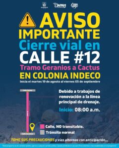 Informamos que a partir de mañana, martes 19 de agosto al 12 de septiembre, realizaremos labores de mantenimiento en la red de drenaje sanitario en la calle Andador 12, en el tramo de Geranios a Cactus en la colonia Indeco.