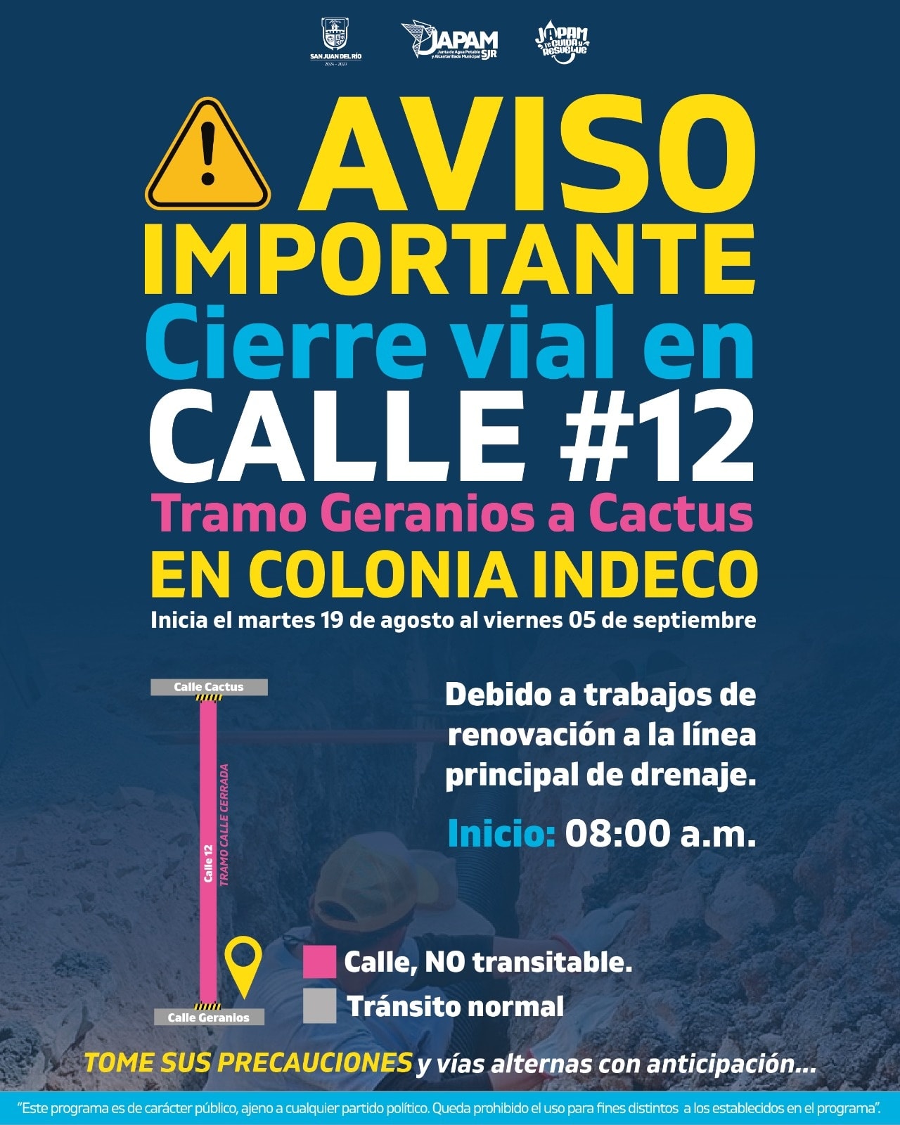 Durante este periodo, la vialidad permanecerá cerrada en dicha calle. Estas acciones son necesarias para fortalecer la infraestructura sanitaria y garantizar un mejor servicio a las y los sanjuanenses.