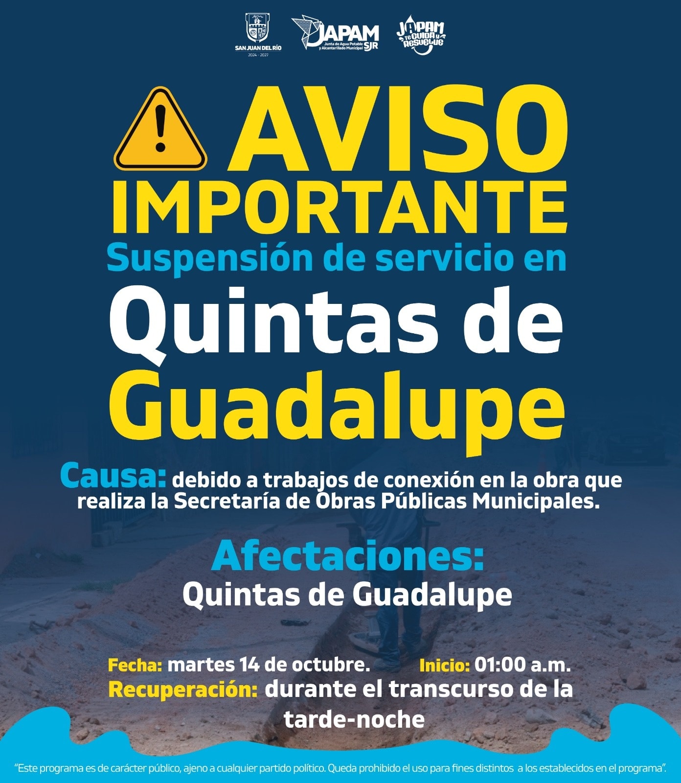 El próximo martes 14 de octubre, se realizará una suspensión en el servicio de agua potable en Quintas de Guadalupe, debido a trabajos de conexión que llevará a cabo la Secretaría de Obras Públicas Municipales.
