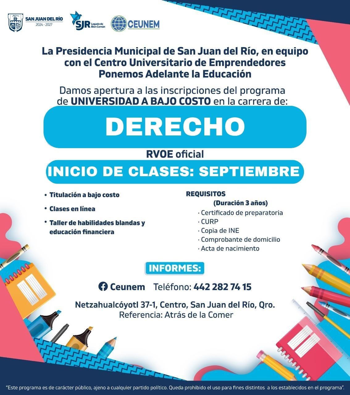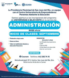 La Presidencia Municipal de San Juan del Río, en equipo con el Centro Universitario de Emprendedores, ponen adelante la Educación y dan apertura a las Inscripciones del programa Universidad a Bajo Costo en las Carreras de Maestría en Derecho Corporativo, Maestría en Administración de Negocios, Pedagogía, Contabilidad, Derecho y Administración.