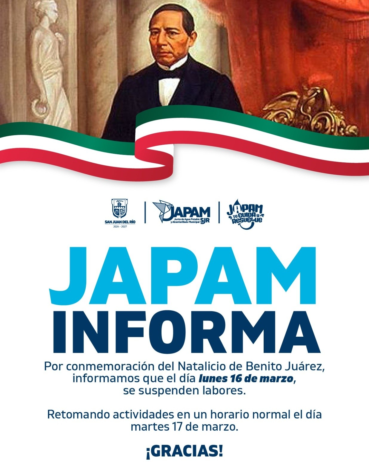 Les informamos que el próximo lunes 16 de marzo se suspenderán labores por ser día inhábil oficial, conforme a lo establecido por la ley.