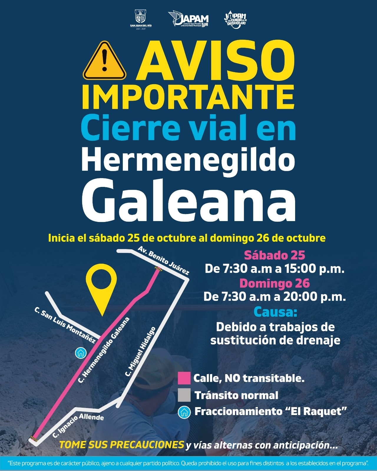 Este sábado 25 y domingo 26 de octubre se realizará el cierre vial en la calle Hermenegildo Galeana, debido a trabajos de sustitución de drenaje.