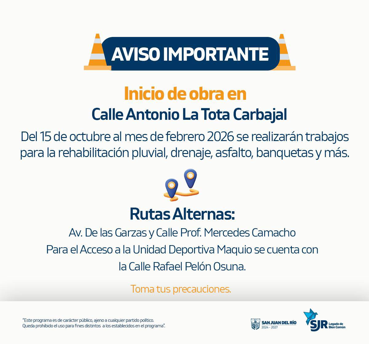 Cierres viales. Te informamos que debido a trabajos de mantenimiento vial, habrá cierres parciales en distintas calles del municipio. Te recomendamos tomar rutas alternas y conducir con precaución. Agradecemos tu comprensión mientras realizamos estas labores que mejoran la movilidad en nuestra ciudad.