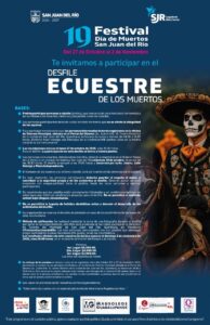 Como parte de las actividades del 19º Festival de Día de Muertos San Juan del Río 2025, este jueves 30 de octubre, a las 18:30 horas, se llevará a cabo el “Desfile y Concurso Ecuestre de los Muertos”, en el que podrán participar jinetes y caballos caracterizados bajo la temática de la celebración de muertos en México, cuyas inscripciones cierran el lunes 27 de octubre a las 15:30 horas.