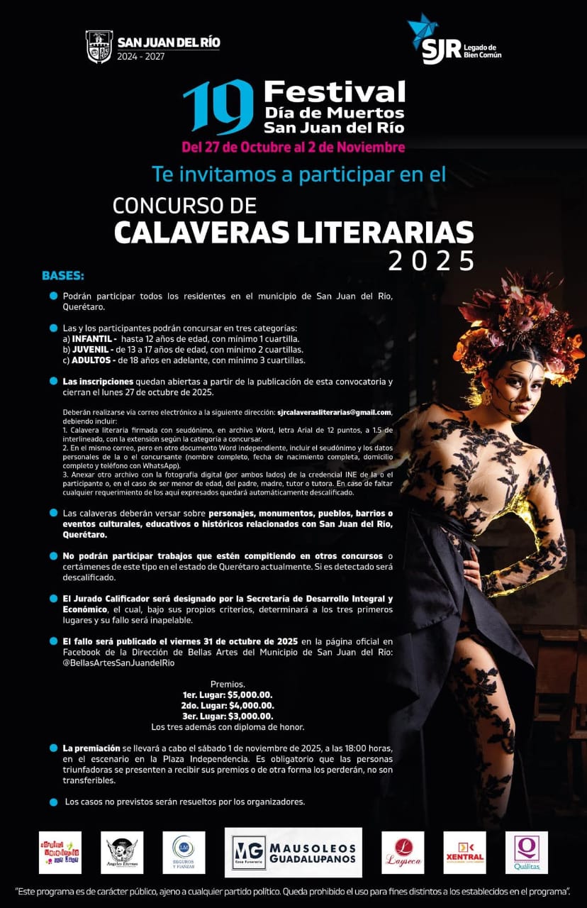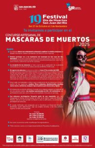 • _El certamen forma parte del 19º Festival de Día de Muertos San Juan del Río 2025, que también contempla los Concursos de Mascotas “Patas y Garras Peludas”, “Máscaras de Muertos”, “Calaveras Literarias” y “Pan de Muerto”._