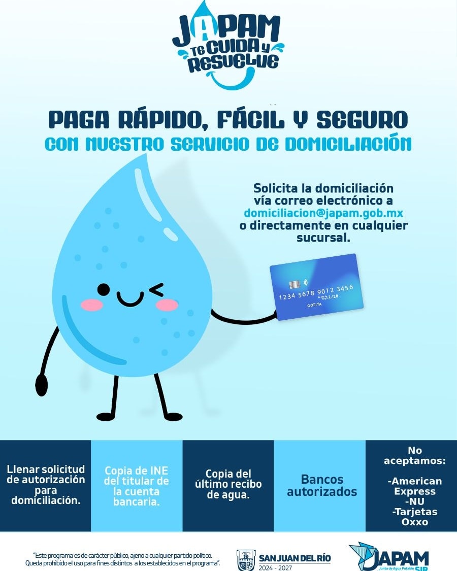 Porque #JAPAMTeCuidaYResuelve, paga de una forma rápida, fácil, segura y sin comisiones.A través de nuestro servicio de domiciliación, te compartimos la documentación necesaria para solicitarlo. Navegación de entradas Jornadas “JAPAM Resuelve Cerca de Ti” Santa Cruz Nieto¡Este viernes hay jornada de vacunación antirrábica!