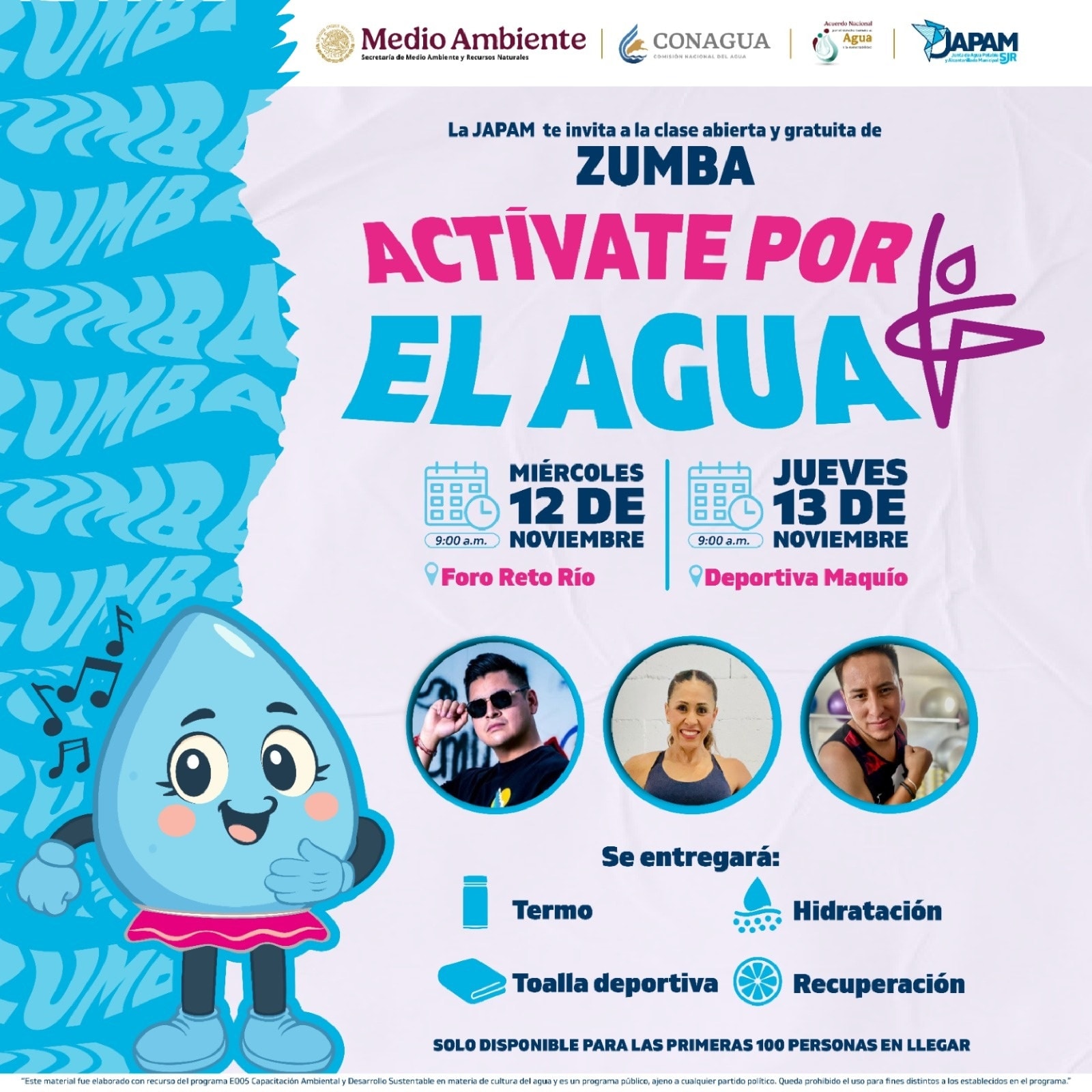 Japam San Juan del Río, Te invitan al evento de Zumba totalmente gratuito, “Actívate por el agua”, te esperamos el próximo Miércoles 12 de noviembre, 9:00 a.m. en Foro Reto Río y el Jueves 13 de noviembre 9:00 a.m. en Deportiva Maquío.