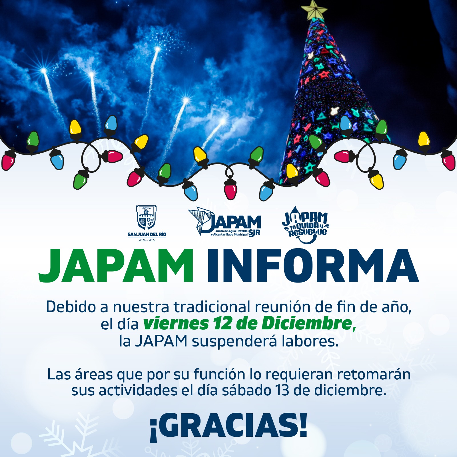 Debido a la tradicional celebración de fin de año, el viernes 12 de diciembre, informamos que la Japam suspende labores.Se contará con guardias en las áreas que por su operatividad lo requieran. Las actividades se reanudarán con normalidad el sábado 13 de diciembre. #JapamTeCuidaYResuelve Navegación de entradas Se reconoce trabajo del sector agropecuario*Gina Sánchez y Roberto Cabrera entregan bolsas de aguinaldo a Delegaciones y Subdelegaciones municipales*