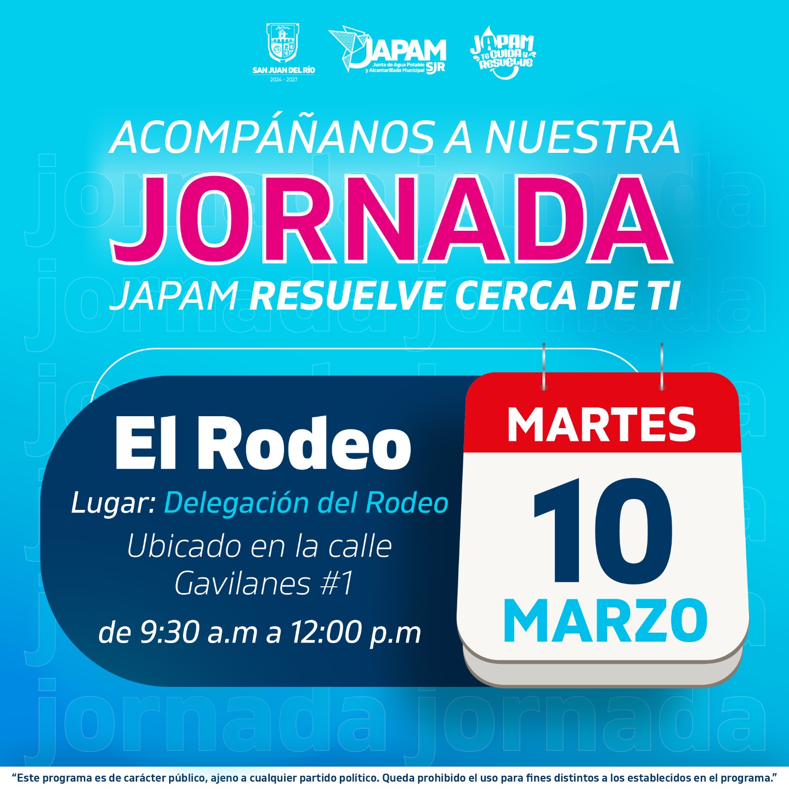 La jornada se llevará a cabo el martes 10 de marzo, en la Delegación de El Rodeo, ubicada en calle Gavilanes #1 en un horario de 9:30 de la mañana a 12:00 del mediodía