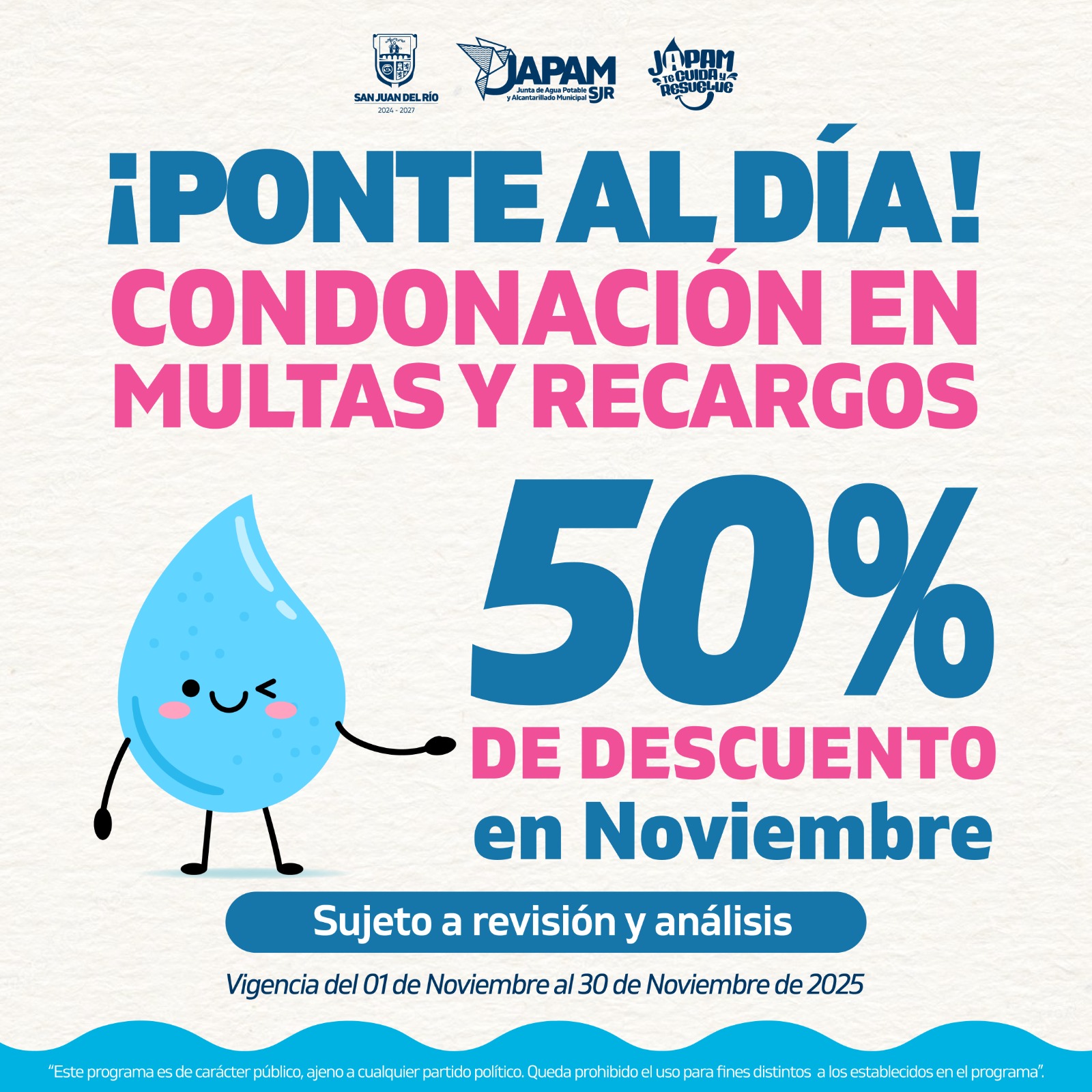 ¡PONTE AL DÍA!” con un 50% de descuento en multas y recargos durante noviembre de 2025. La promoción aplica del 1 al 30 de noviembre. Para aprovechar el descuento en multas y recargos de JAPAM, sigue estos pasos: