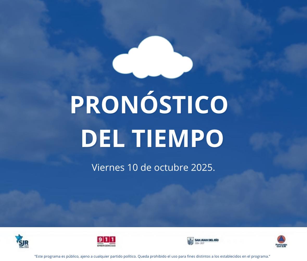10 de octubre en San Juan del Río, se espera cielo parcialmente nublado, con 60% de probabilidad de lluvia.