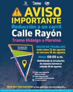 A partir de mañana hasta el viernes 15 de agosto realizaremos trabajos de arreglo del arroyo vehicular derivados de reparaciones en la línea de agua en Calle Rayón, en el tramo comprendido entre Hidalgo y Morelos.