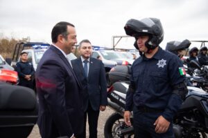 • El alcalde Sanjuanense, Roberto Cabrera Valencia, detalló que se entregaron 15 patrullas, una camioneta de traslado, 10 motocicletas, 10 bicicletas, 46 chalecos balísticos, más de mil 600 piezas de uniformes y 78 equipos de cómputo._