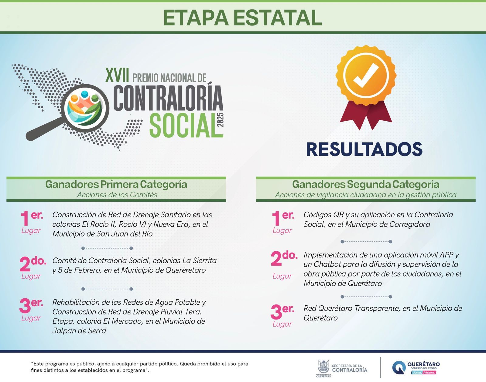 “Con este triunfo, San Juan del Río se consolida como un referente en materia de contraloría social y participación comunitaria. El Comité Los Rocíos representará al estado de Querétaro en la etapa nacional del XVII Premio Nacional de Contraloría Social 2025”, remató Toño Pérez.