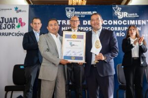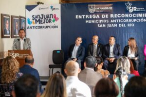 Por su compromiso ético y firme dedicación en la lucha contra la corrupción, al haber concluido satisfactoriamente la capacitación “Municipios Anticorrupción” y alcanzar 100 por ciento de su personal, el Sistema Estatal Anticorrupción Querétaro (SEAQRO) entregó un reconocimiento al municipio de San Juan del Río, que fue recibido por el alcalde sanjuanense, Roberto Cabrera Valencia.