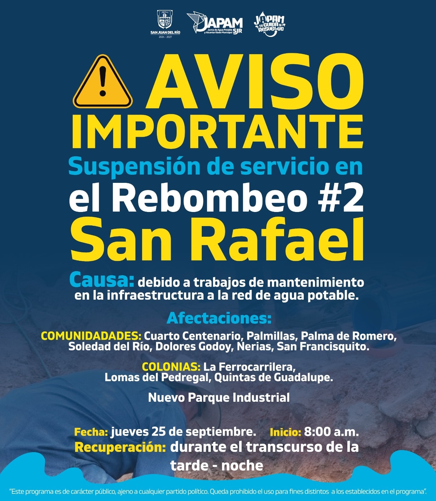 Este jueves 25 de septiembre la Japam realizará trabajos de mantenimiento en la infraestructura del rebombeo 2, San Rafael.