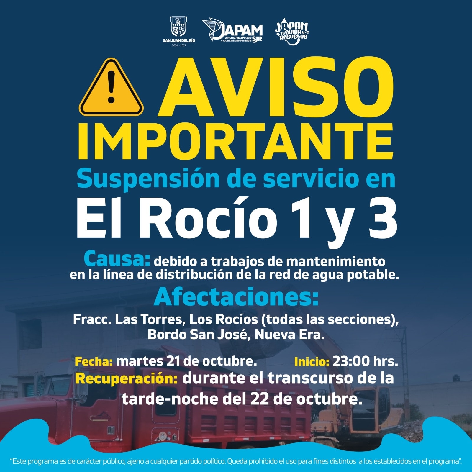 El día de mañana 21 de octubre, se realizará una suspensión en el servicio de agua potable en diversas colonias a partir de las 11:00 PM, debido a trabajos de mantenimiento en la línea de distribución de la red de agua potable.