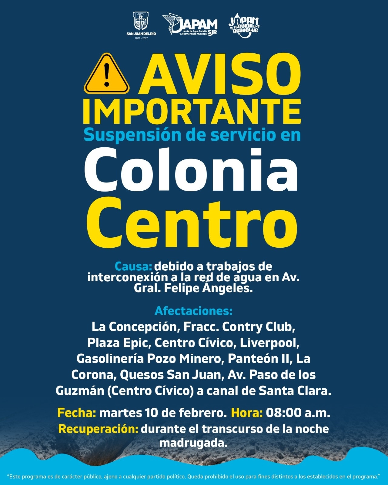 Con motivo de trabajos de interconexión a la red de agua potable, el servicio se suspenderá el martes 10 de febrero a partir de las 08:00 a.m., en Av. Gral. Felipe Ángeles.
